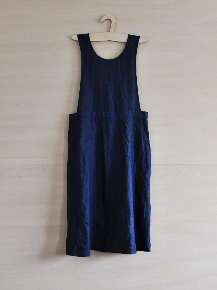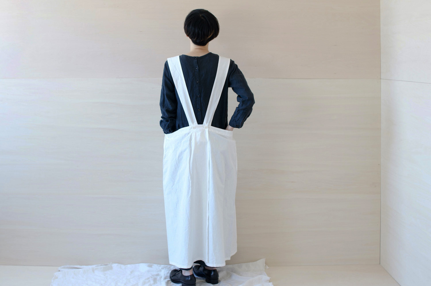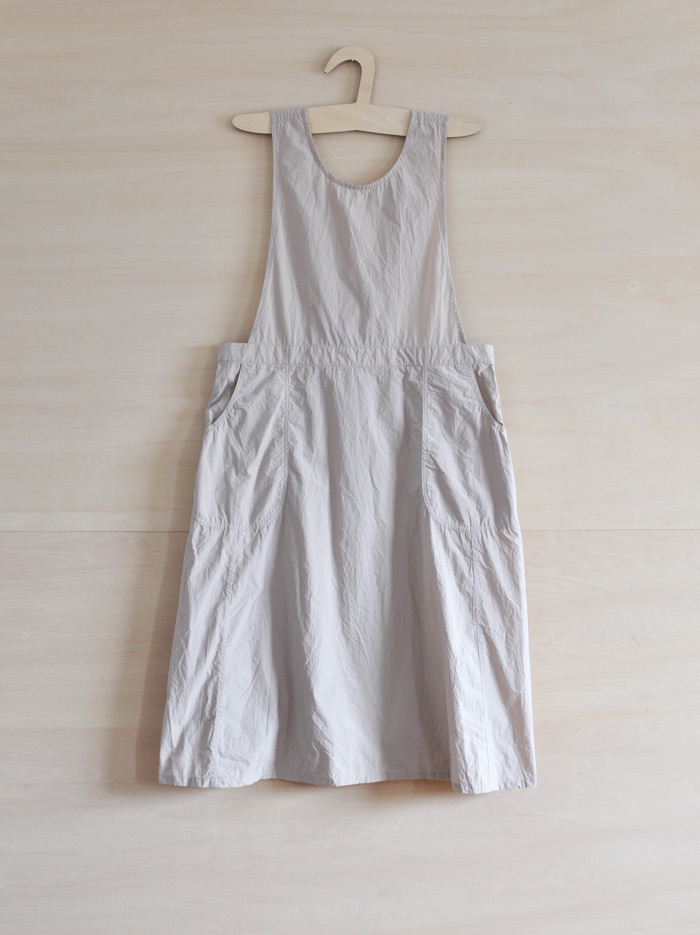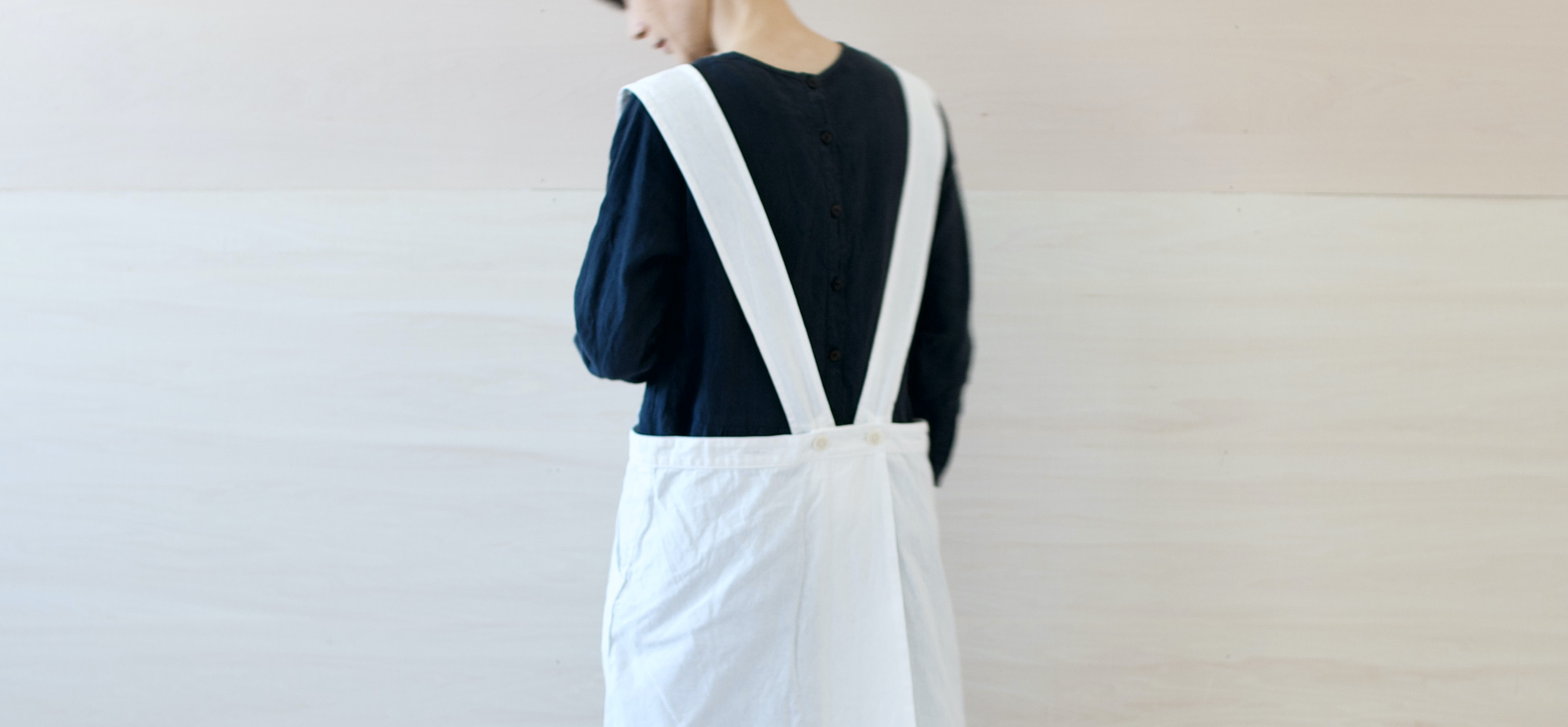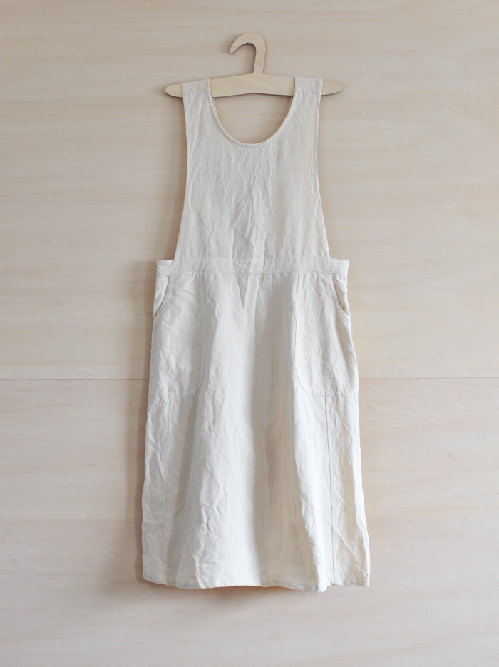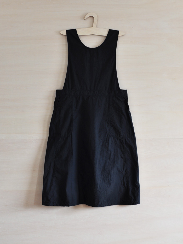 チェコ軍のメディカルエプロンをベースに作ったエプロンです。チェコの多くの女性が使用したことを想像し、チェコの女性の代表的な名前の一つ「hana」をこのエプロンに名付けました。ミリタリーの良いとろころは機能性から生まれるラインの美しさ。随所に工夫がちりばめられています。いいところはそのままに、新たにパターンをつくりました。(デットストックを調べていくと、サイズは大小様々あり、チェコの女性はかなり大柄な方がいたことを連想させてくれます。)あえてオーバーサイズでつくり、ワンピースのようにゆったりと着られるようになっています。また、重ね着しても楽しめそうです。ウエストの左右には、ボタンホールが3箇所ずつあり、ウエストサイズが調整できるようになっています。肩ひもはウエストのボタンホールにつけて固定するため、ストレート、クロスと変えることができます。ボタンを止める位置次第でいろんなニュアンスを楽しめるようになっています。